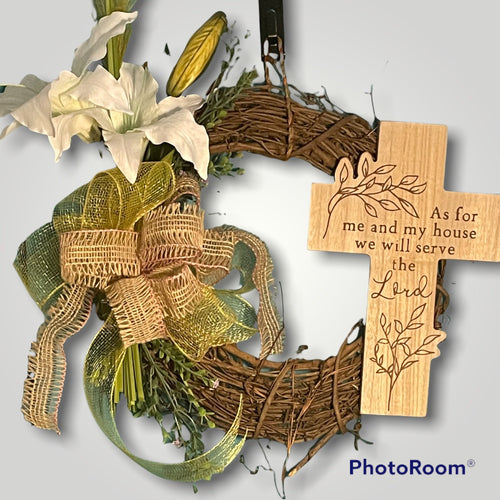 Easter Lily and Cross Grapevine Wreath, Religious Decor
