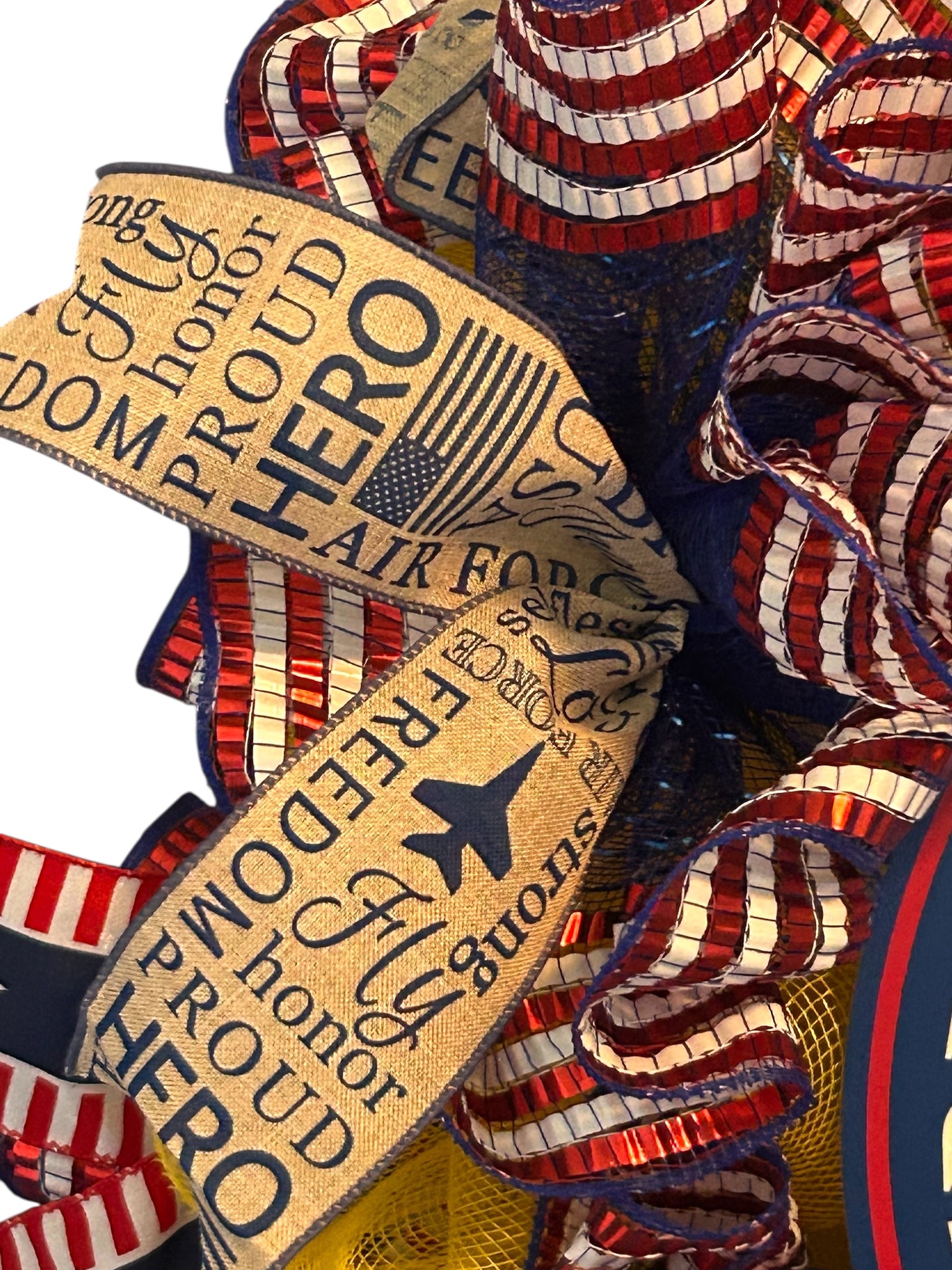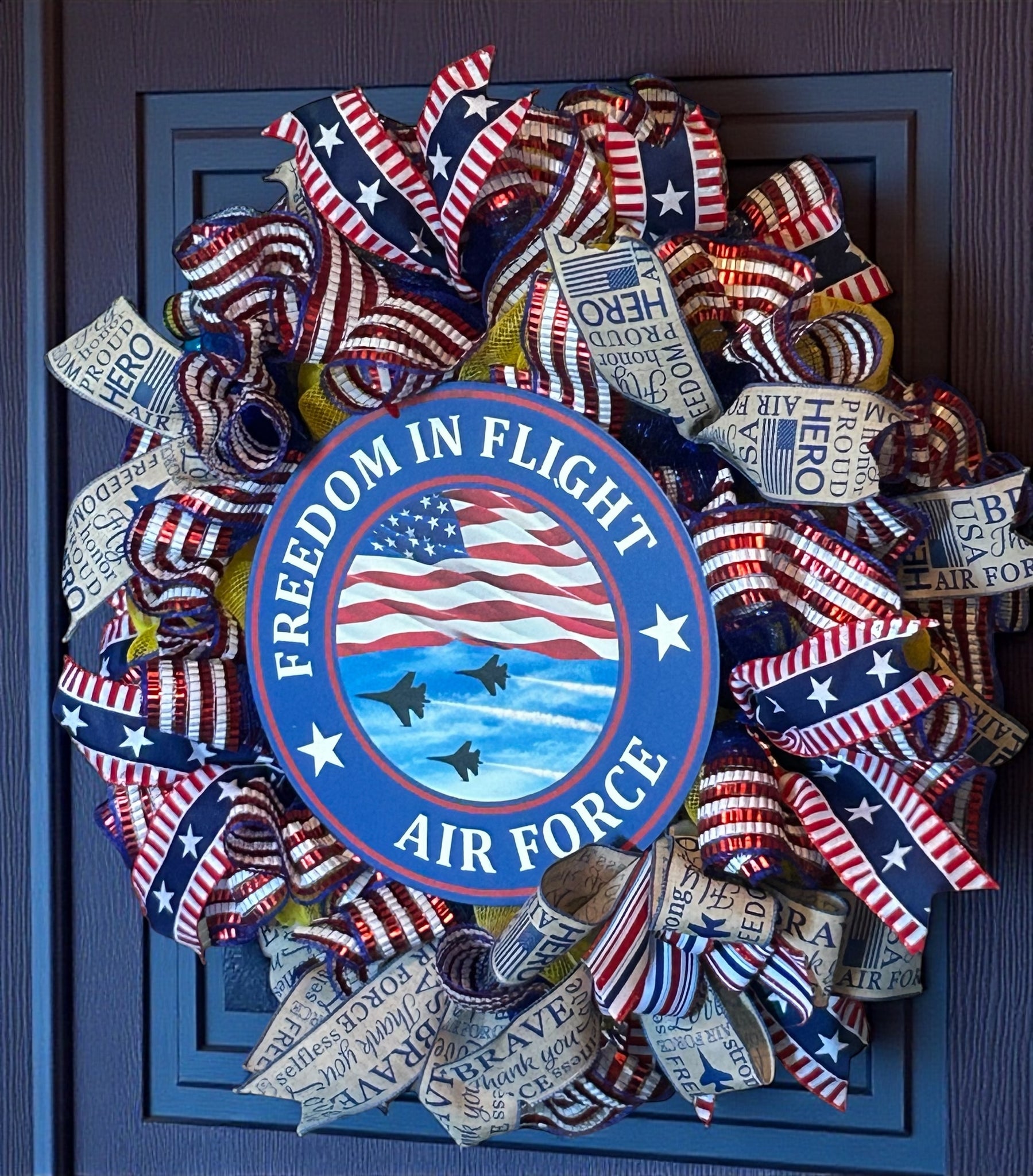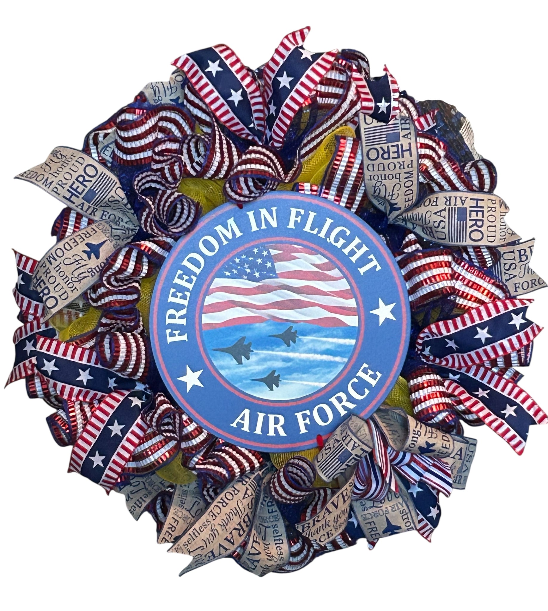 This Air Force Wreath is the perfect addition to any military-inspired decor. Show your patriotism and honor our veterans with this beautifully designed wreath. A great gift for any Air Force member or supporter. On a 14-inch metal wired form, base is covered with yellow deco mesh and ruffles of blue metallic with red and white stripes. The metal sign “Freedom in Flight Air Force” is 12 inches. Patriotic ribbon tails and bows including Airforce theme throughout wreath. Wreath is approximately 24 inches.