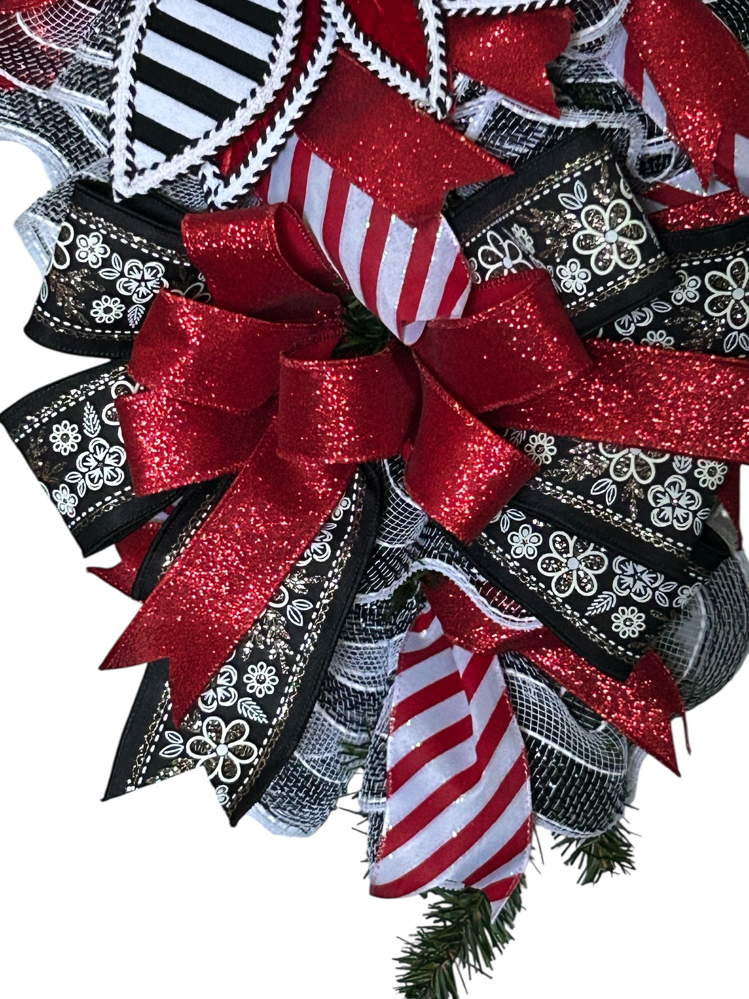 This elegant Christmas swag is the perfect addition to your holiday decor. Featuring a beautiful combination of black, red, and white, it adds a touch of sophistication to any space. This Christmas swag is sure to bring joy and festive cheer to your home. On a 30 inch pine faux swag, base is covered with a black and white metallic deco mesh. Swag is embellished with felt red, white and black fern picks, poinsettia, and even Christmas presents pick. Embellished with coordinating ribbon tails and bows. Christmas Swag is approximately 38 x 18 inches.