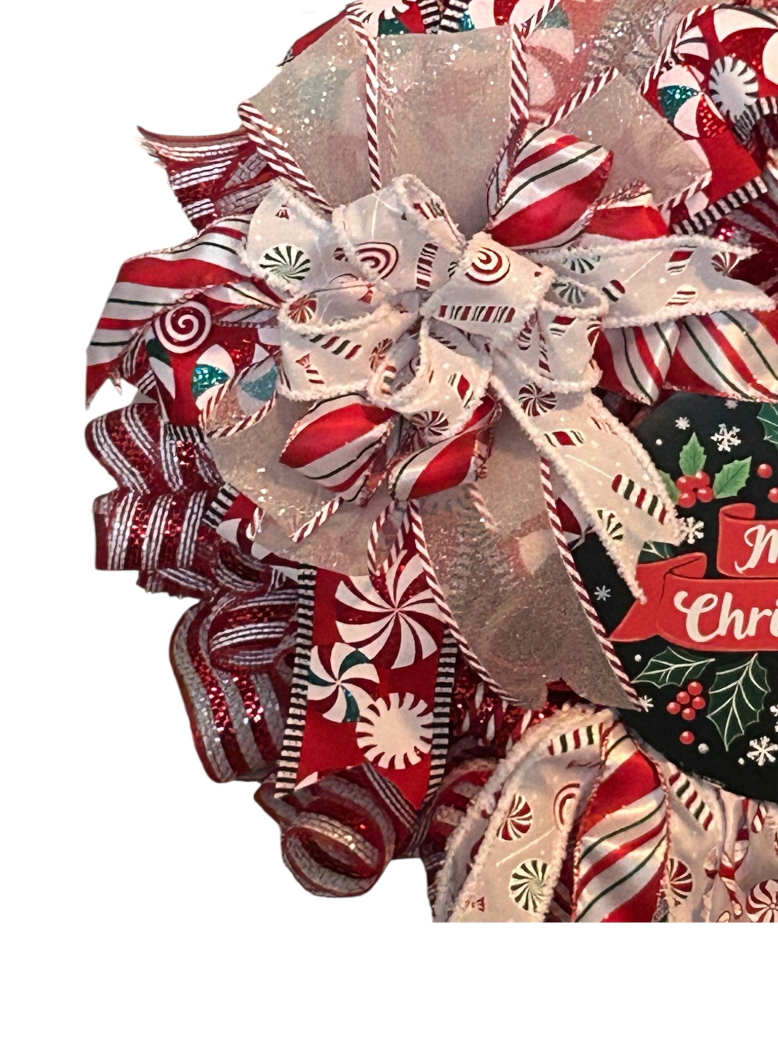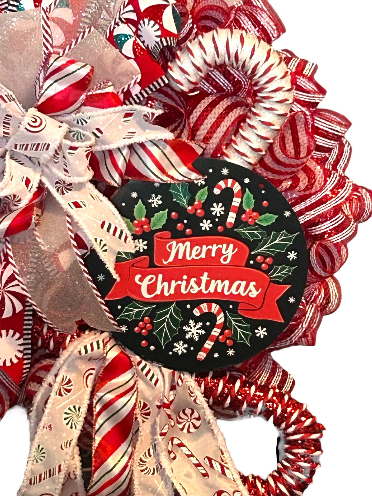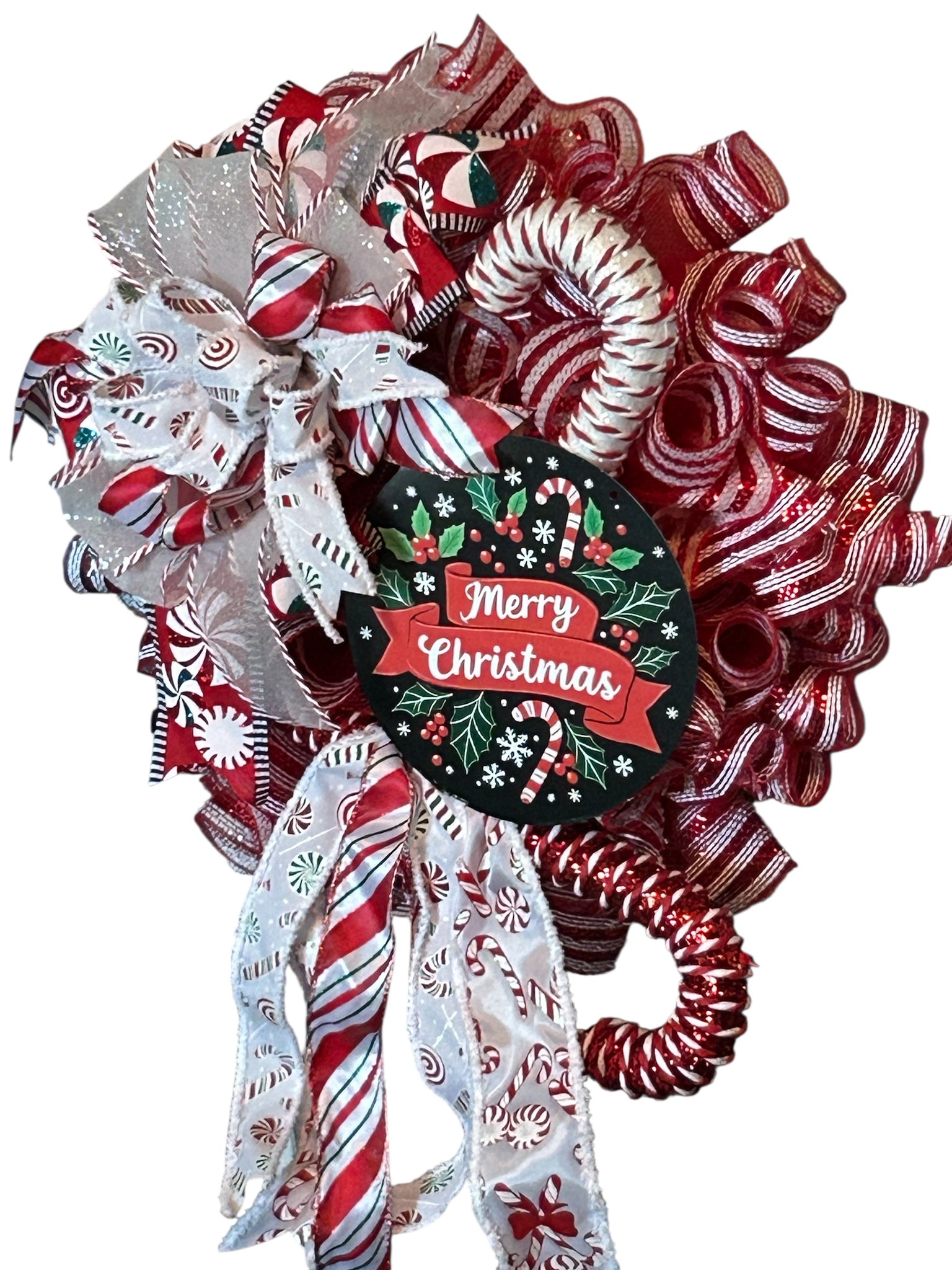 Enhance your holiday decor with our festive Candy Cane Christmas wreath. Featuring a classic design of red and white candy canes, this wreath will add the perfect touch of sweetness to your home. Celebrate the season with our Merry Christmas Wreath, the perfect addition to your holiday decorations. On a 12 inch metal wired wreath form, base is covered with red and white decor mesh. The Merry Christmas sign is 8 inches, aluminum. Two foam candy canes, candy theme ribbon tails and a bow. Wreath is approximately 21 inches.