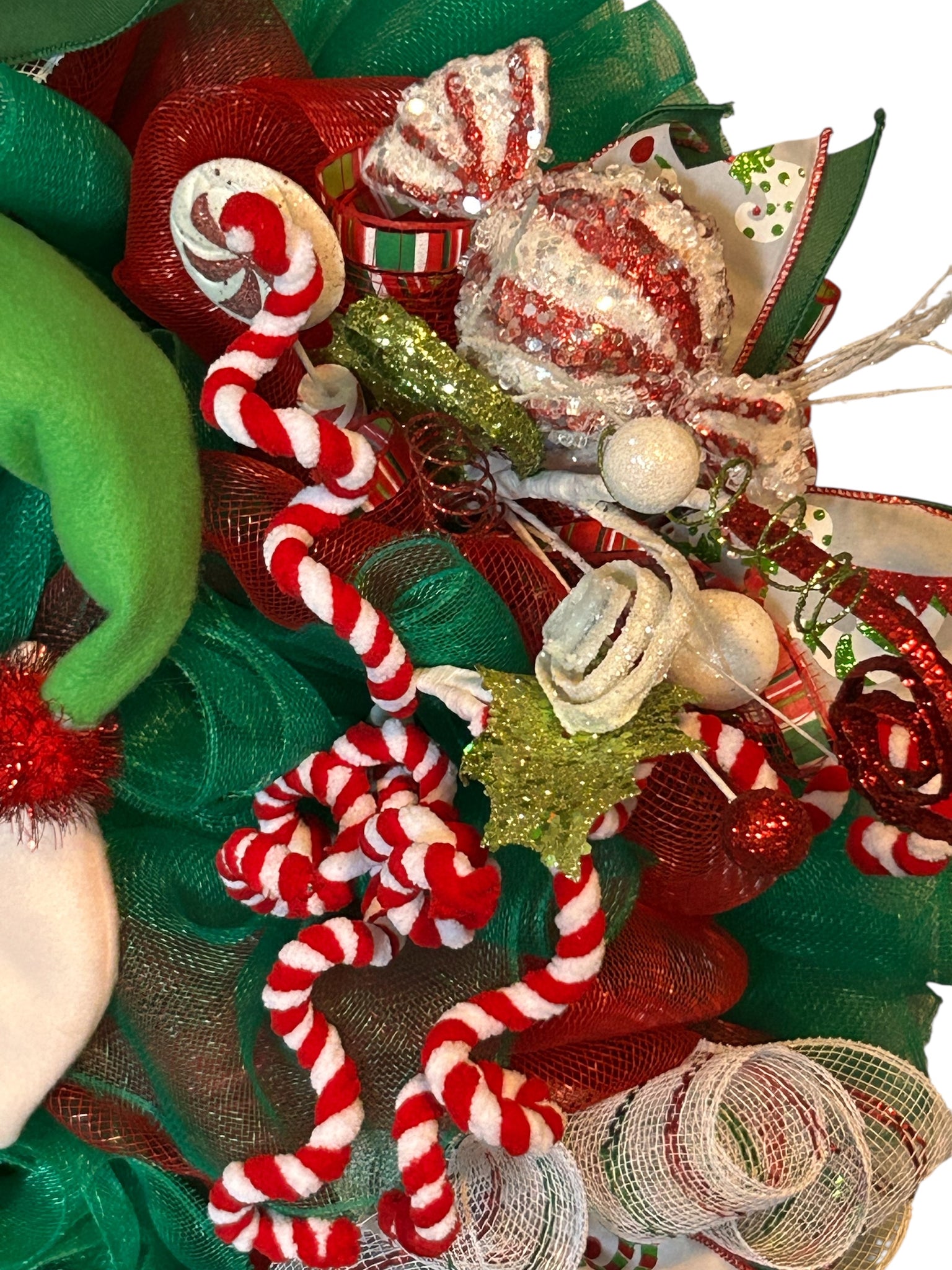 Add a whimsical touch to your holiday decor this year with our Elf Christmas Wreath. This festive wreath features a cheerful elf design, perfect for spreading Christmas cheer. Hang it on your front door or in your home to welcome guests and get into the holiday spirit. On a 14 inch metal wired wreath form, the base is covered with red, green, white deco mesh. The plushed Elf is approximately 22 x 9 inches. Christmas candy and red and white curly picks. Coordinating bow and ribbon tails including Elf theme. Wreath is approximately 25 inches.
