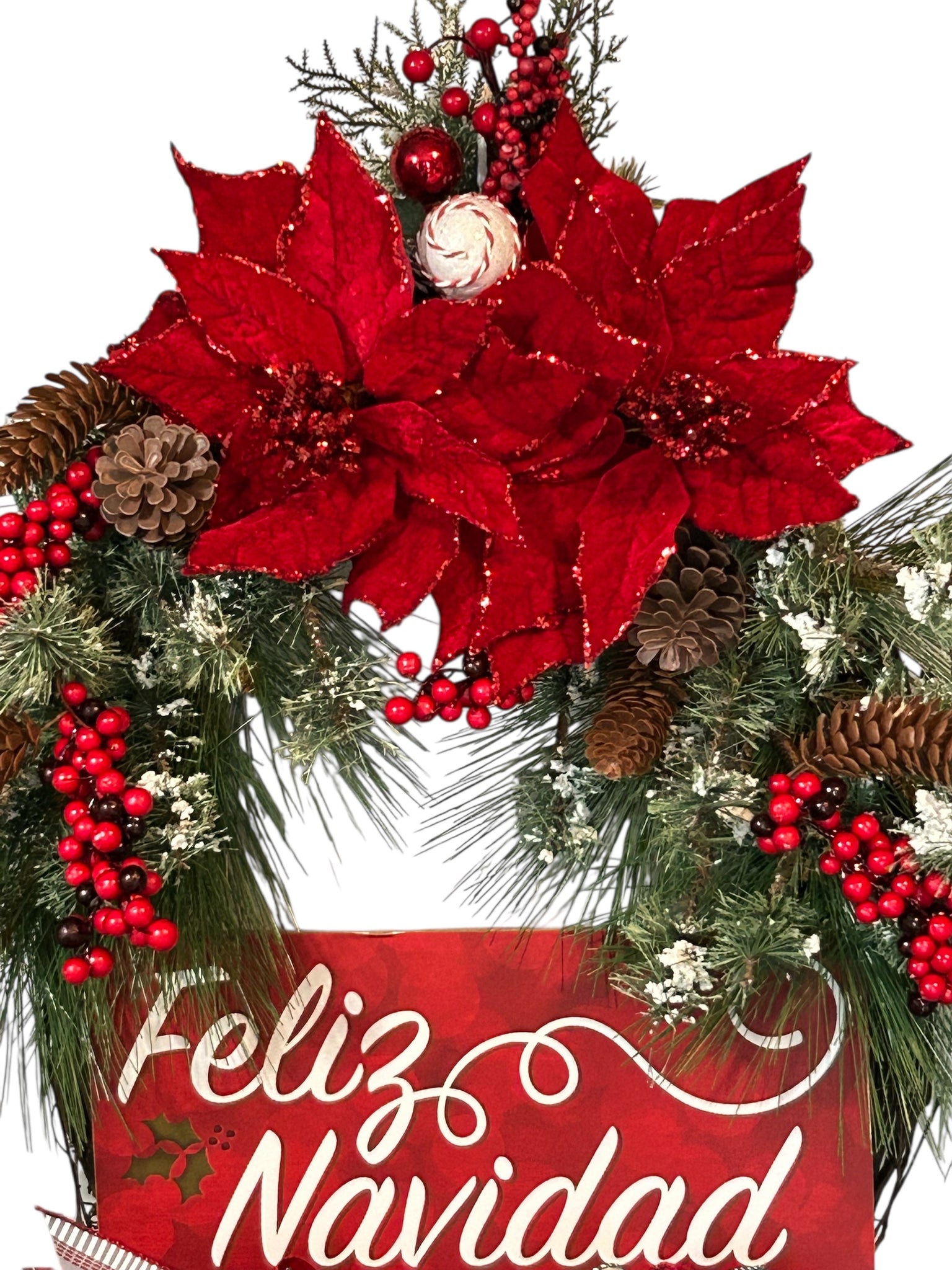Welcome the holiday season with our Feliz Navidad Wreath - the perfect addition to any Christmas decor! Handcrafted with a grapevine base, this wreath exudes festive cheer with vibrant colors and a traditional "Feliz Navidad" sign. Bring joy and warmth, to your home with this unique Christmas piece. On an 18 inch oval grapevine, wreath is embellished with faux winter floral picks, including pinecones, pine needles and red berries. Two red felt poinsettias and a bow. The wood “Feliz Navidad” sign is 6 x 12.5 inches. Wreath is approximately 32 x 25 inches.