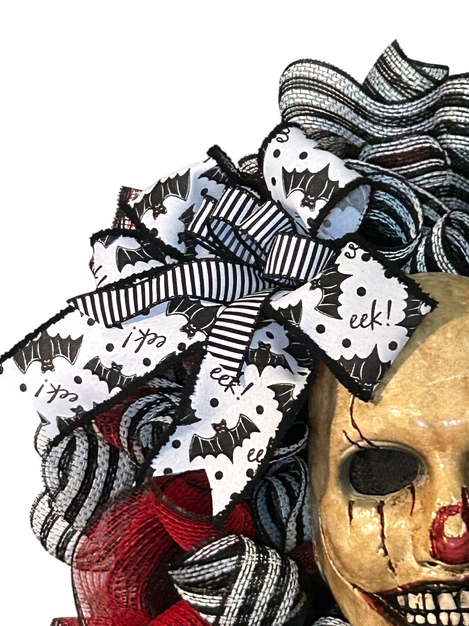 Unleash your fearless spirit with our Grin of the Dead Wreath! This Halloween wreath will add a spooky touch to your decor. It's perfect for those who love to take risks and embrace the thrill of the unknown. Don't miss out on this daring addition to your Halloween decorations! On a 10 inch metal wired wreath form, base is covered with a red and black stripe decorated with mesh and black metallic mesh with a foil black and white stripe trim. The Grin of the Dead mask is 9 x 7 inches is made of strong vinyl/plastic. Wreath is embellished with a bat theme bow. Wreath is approximately 22 inches.