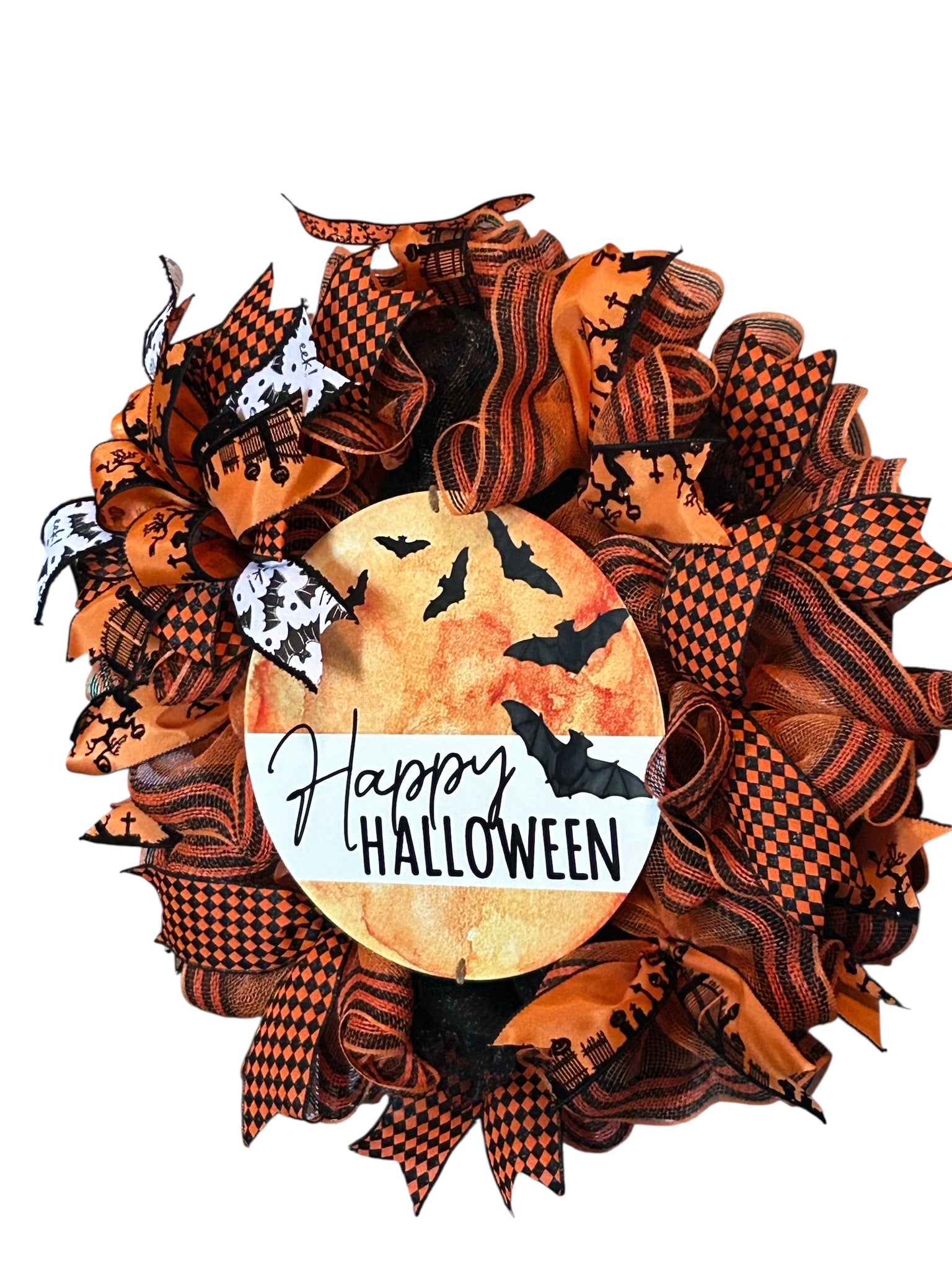 This Halloween wreath will add festive flair to your home decor. Featuring bats and the phrase "Happy Halloween", it's the perfect addition to any Halloween celebration. Bring a touch of spooky fun to your doorstep with this Halloween wreath. On a 14 inch metal wired wreath form, base is covered with black deco mesh and ruffles of orange mesh with black and orange stripe trim. The 12 inch metal “Happy Halloween” sign includes images of spooky bats. Coordinating ribbon tails and bow completes the wreath. Wreath is approximately 25 inches.