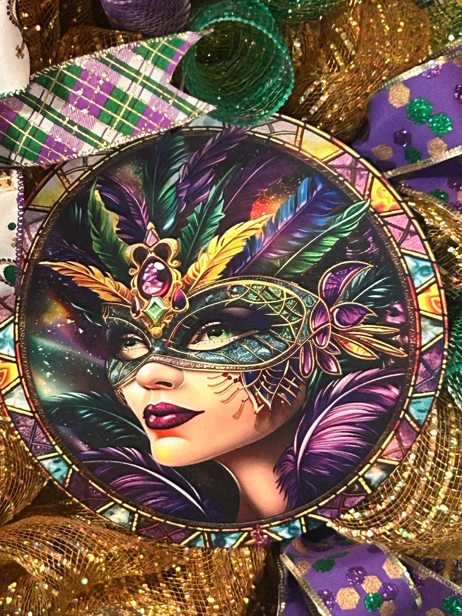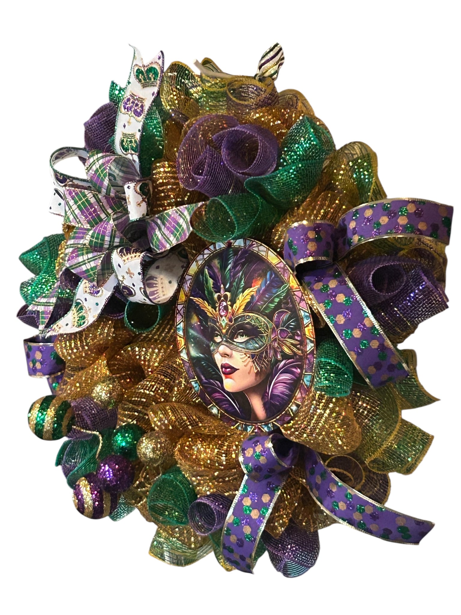 Decorate your space for Fat Tuesday in style with our festive Mardi Gras Decor. Let the good times roll and celebrate with our Mardi Gras Wreath. On a 12 inch metal wired wreath form, base is covered with gold metallic deco mesh and ruffles of multicolor mesh gold, green and purple. The Mardi Gras aluminum sign is 8 inches. Wreath is embellished with glitter Mardi Gras theme ball pick and ribbon tails and bow. Wreath is is approximately 22 inches.
