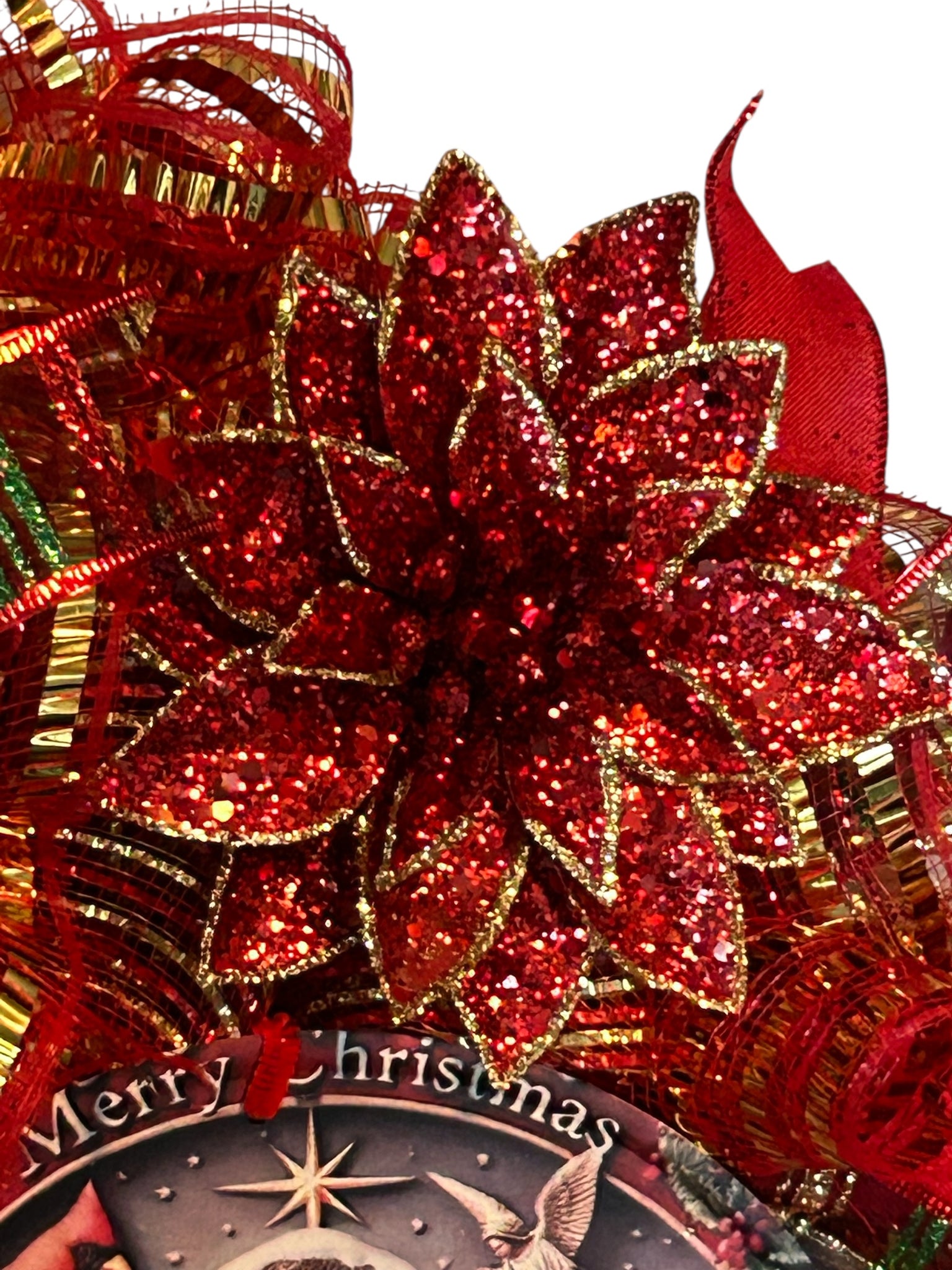 "Add a touch of traditional Christmas charm to your home with our Merry Christmas Nativity Wreath. This beautifully crafted wreath features a charming nativity scene, perfect for celebrating the true meaning of Christmas. Bring joy and warmth to your holiday decor with this lovely wreath." On a 14 inch metal wired wreath form, base is covered with a red and gold stripe foil decorated with mesh and ruffles of red with gold stripes trim mesh. The Nativity metal sign is 8 inches. Two red poinsettias with gold trim. Coordinating bow and ribbon tails. Wreath is approximately 25 inches.