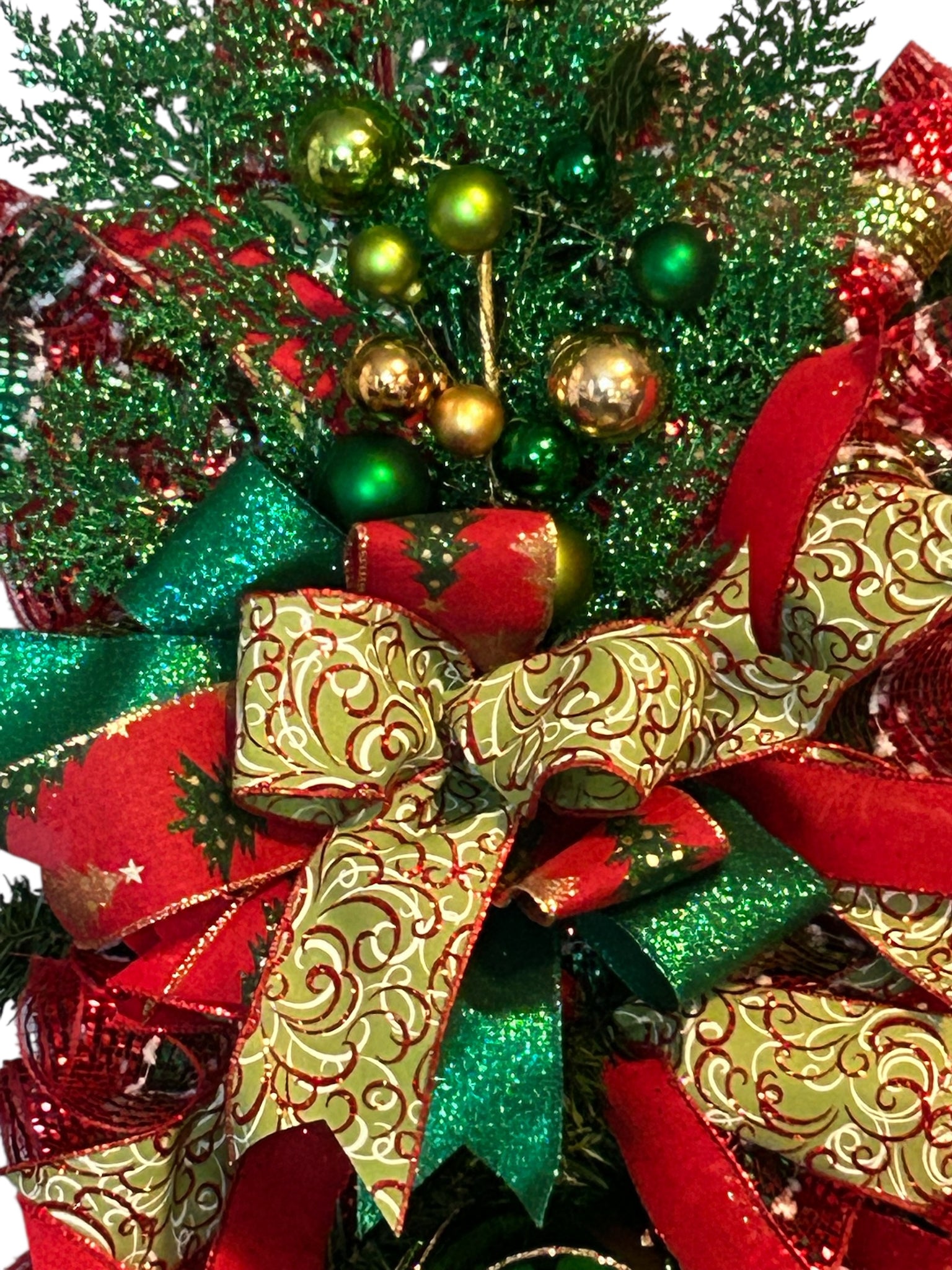 Add the perfect festive touch to your home with our Red and Green Christmas Swag! This beautifully crafted swag will bring holiday cheer to any room. Don't wait any longer to elevate your holiday decor with this must-have piece. On a 30 inch pine faux swag, base is covered with red and green metallic foil mesh with snowdrift stripes. Three tier beautiful Christmas ornaments and green and gold ornament pick. Swag is embellished with green metallic fern picks and red and gold metallic poinsettia and coordinating ribbon tails and bows. Swag is approximately 36 x 16 inches.