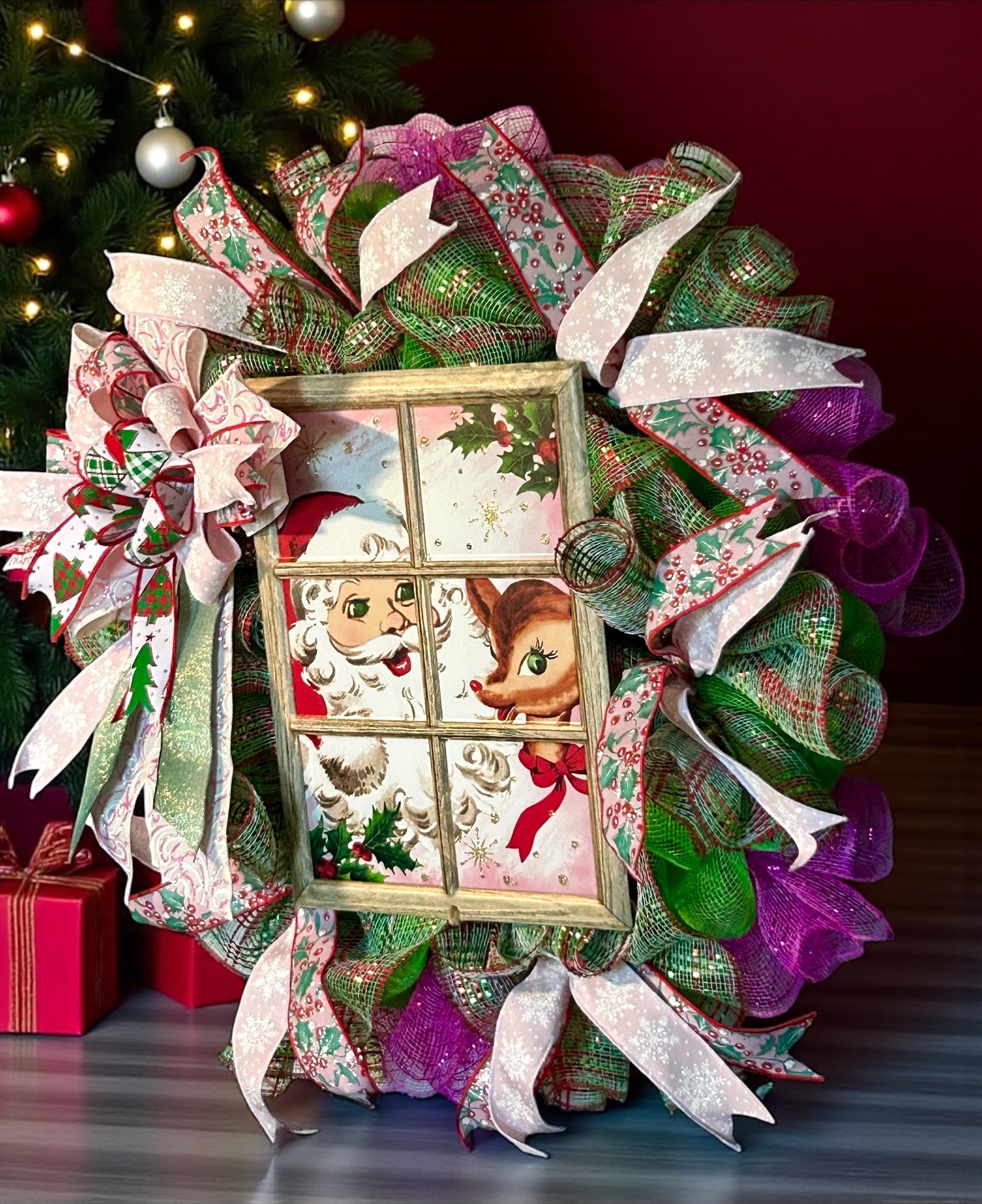 Add some festive flair to your home with this charming Santa and Rudolph Christmas wreath. Its merry and bright design will bring joy to any room. Perfect for adding a cozy touch to your holiday decor. Spread some Christmas cheer with this delightful wreath. On a 14 inch metal wired wreath form, base is covered with green deco mesh and ruffles of hot pink metallic mesh and plaid mesh of green, red, and gold thin foil stripes. The aluminum Santa and Rudolph sign is 12.5 x 9.5 inches; sign is window like frame. Ribbon tails and bow. Wreath is approximately 25 inches.