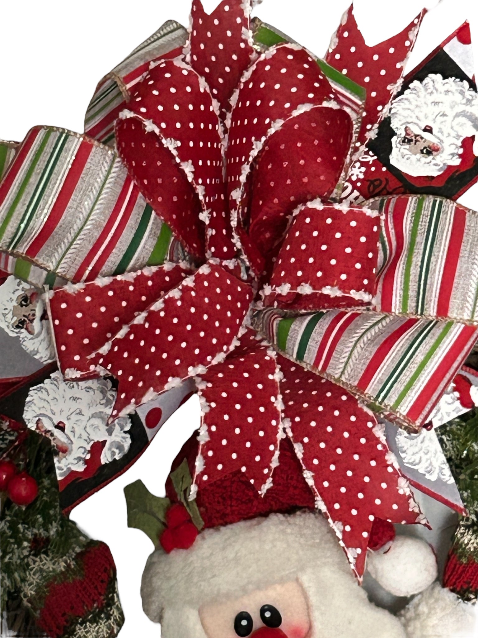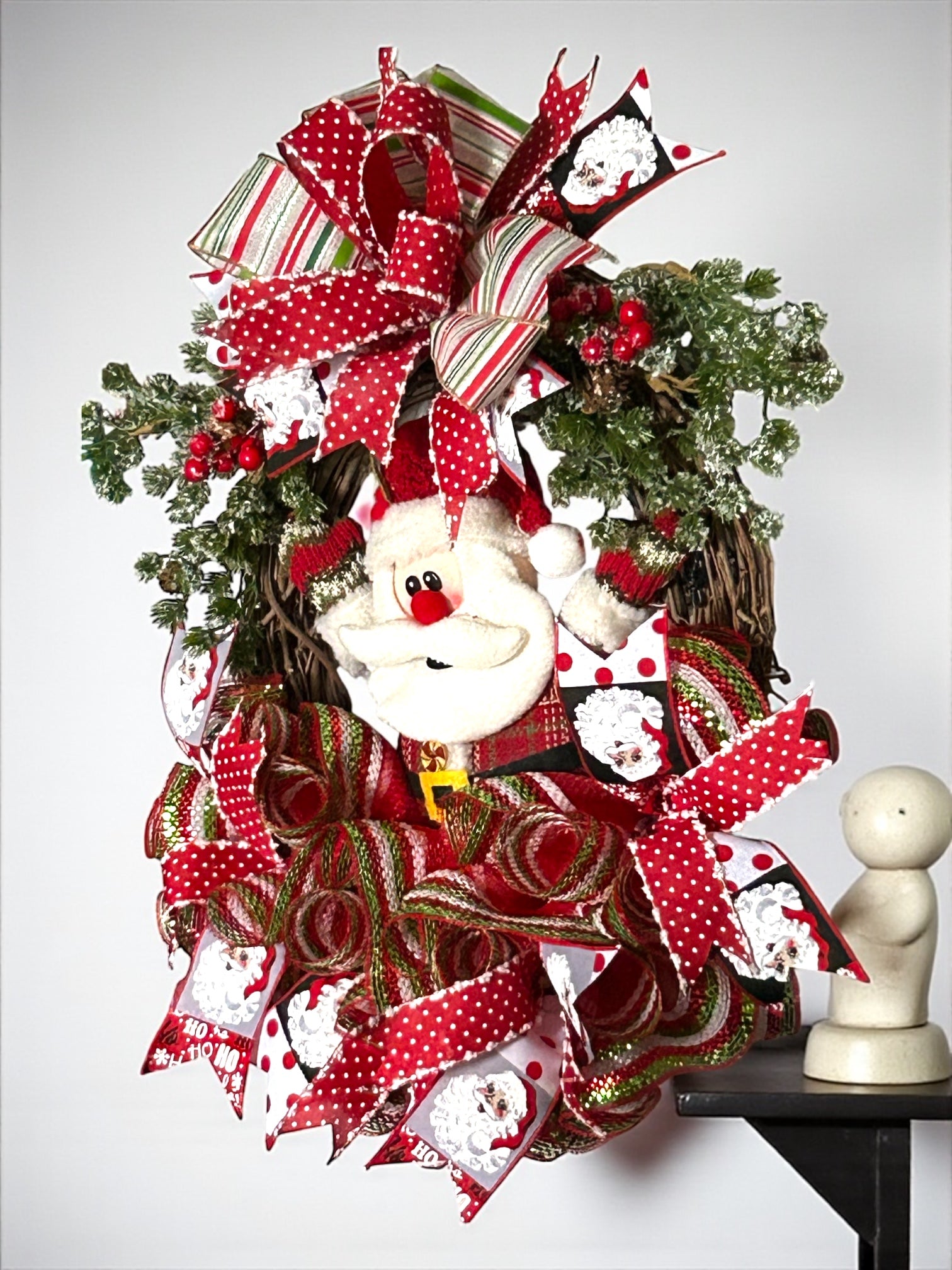 Add a touch of Christmas cheer to your home with our Santa Christmas Grapevine Wreath. This festive wreath, featuring a jolly Santa and classic Christmas decor, will bring joy to all who see it. Perfect for hanging on your door or anywhere in your home, this wreath will spread holiday cheer all season long! Ho ho ho! On an 18 inch oval grapevine form, wreath has a stuffed Santa, and ruffles of decoration mesh with red, green and white foil stripes trim. Ribbon tails and bow, including Santa theme and faux winter flocked greenery picks and red berries. Wreath is approximately 25 x 20 inches.